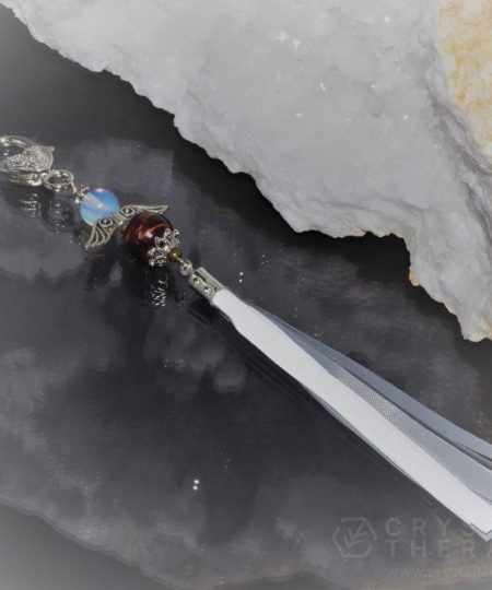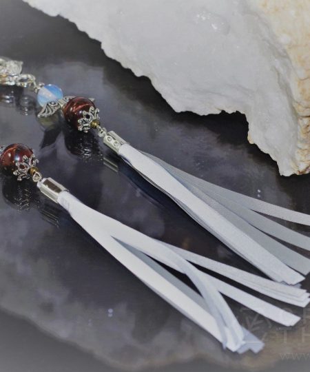 Kaunistuse valmistamisel on kasutatud punast tiigrisilma ja või opaliidi helmeid.